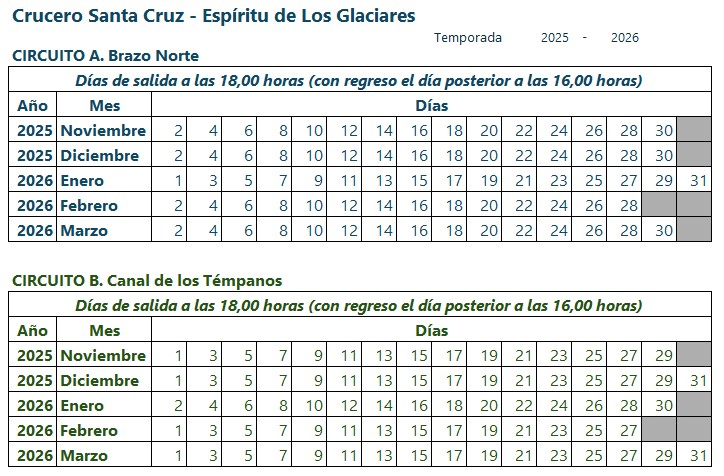 The adventure begins at Puerto La Soledad, Bahía Tranquila (Punta Bandera), 45 kilometers from El Calafate, starting at 5:45 p.m., boarding the exclusive Santa Cruz Cruise. Depending on your booking date, you can enjoy one of our two exclusive circuits (Circuit A or Circuit B; see Departure Calendar). You can choose the one-night option for one tour, or if you prefer, book two nights to explore both circuits and maximize your experience.