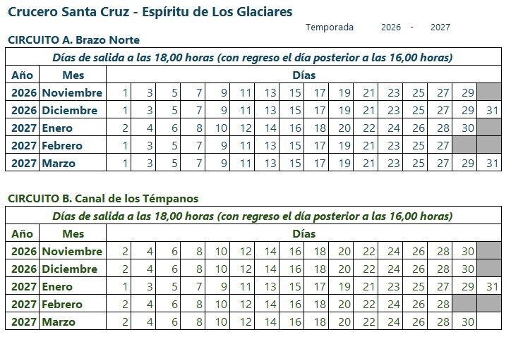The adventure begins at Puerto La Soledad, Bahía Tranquila (Punta Bandera), 45 kilometers from El Calafate, starting at 5:45 p.m., boarding the exclusive Santa Cruz Cruise. Depending on your booking date, you can enjoy one of our two exclusive circuits (Circuit A or Circuit B; see Departure Calendar). You can choose the one-night option for one tour, or if you prefer, book two nights to explore both circuits and maximize your experience.
